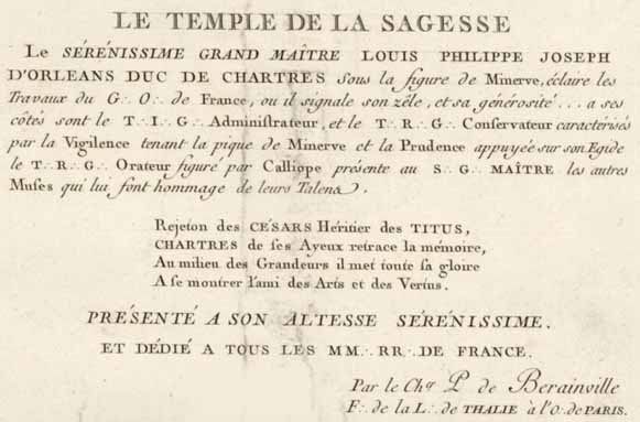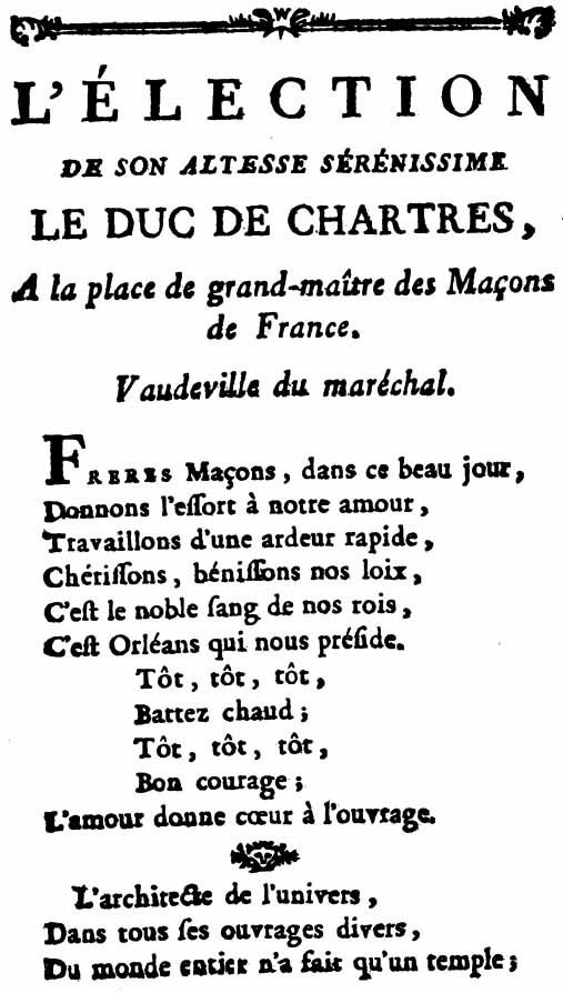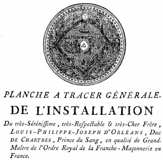 L'Installation du duc de Chartres comme Grand Maître du nouveau Grand Orient avait eu lieu le 22 octobre 1773. Le Tracé en a été publié.