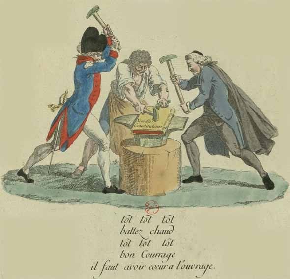 Ce refrain illustre, dans cette estampe de la BNF (qui doit avoir eu beaucoup de succès à l'époque, puisqu'on en trouve d'autres versions, par exemple ici ou ici), le thème de la collaboration des 3 Ordres pour le forgeage de Nouvelles Constitutions :