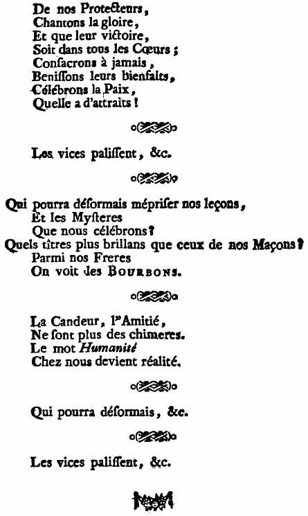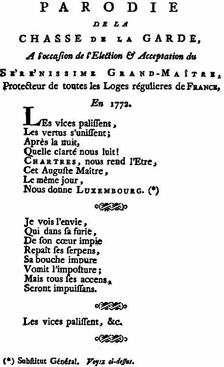 Autre curiosité : la chanson est datée de 1772, alors que, comme nous l'avons vu dans une page précédente, l'installation officielle du Duc de Chartres en tant que Grand Maître du Grand Orient n'eut lieu que le 22 octobre 1773. L'explication est très simple : ce que célèbre cette chanson, ce n'est pas l'installation du Duc, mais son élection. Celle-ci avait eu lieu en 1771, le 24 juin, pour faire pièce à la déconfiture de la Grande Loge de France et suite au décès du comte de Clermont. Si les choses ont traîné en longueur, c'est dû au fait que Chartres était alors en disgrâce à la Cour.